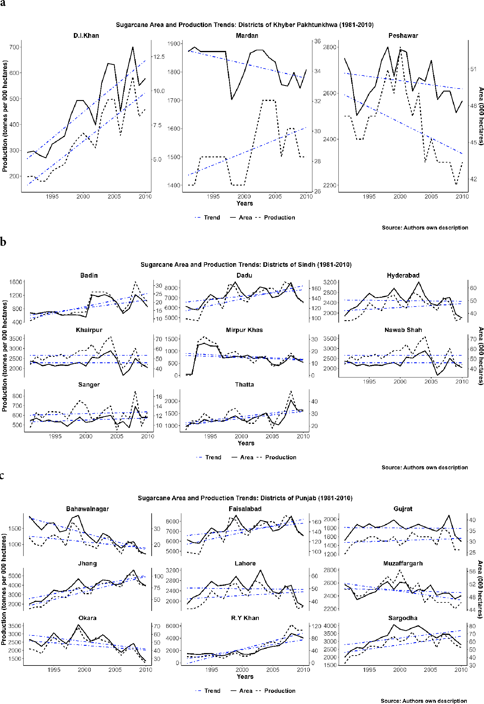 We based the analyses on a monthly time series from 1951 to 2010 from 20 leading sugarcane-producing districts in Pakistan. After 2010, several new districts were created, and their historical data became unavailable. Therefore, the final sample was restricted to 2010.