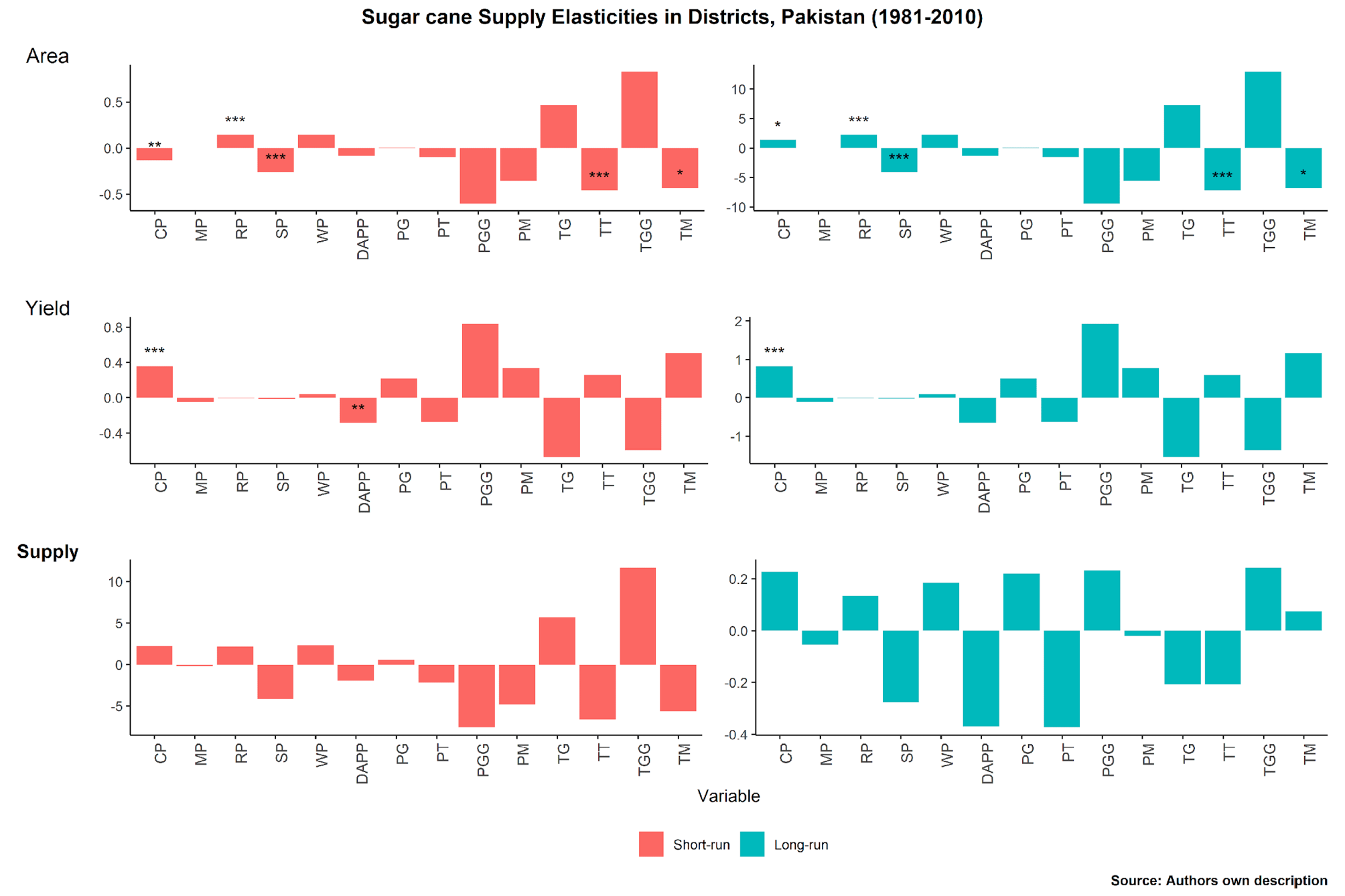 The rice and wheat prices have positive short-run elasticities, while the sugarcane price has a negative short-run elasticity for the area (Figure 3). Overall, the short-run price and non-price elasticities for the area response are very small, except for precipitation and temperature at the grand growth stage (β < 0.50). Regarding the yield response, four non-price factors – precipitation at grand growth (0.84%), temperature at germination (-0.67%), temperature at grand growth (-0.59%), and temperature at maturity (0.51%) – show higher short-run elasticities. Overall, price leads to positive changes in the sugarcane supply response: a 1% average price increase may increase the supply response by 0.07% in the long run. Non-price factors, such as precipitation and temperature, have negative long-run elasticities. This outcome confirms that the average non-price supply response is higher than price responses, and in the long run, acreage does not increase with the price (Siegle et al., 2024).