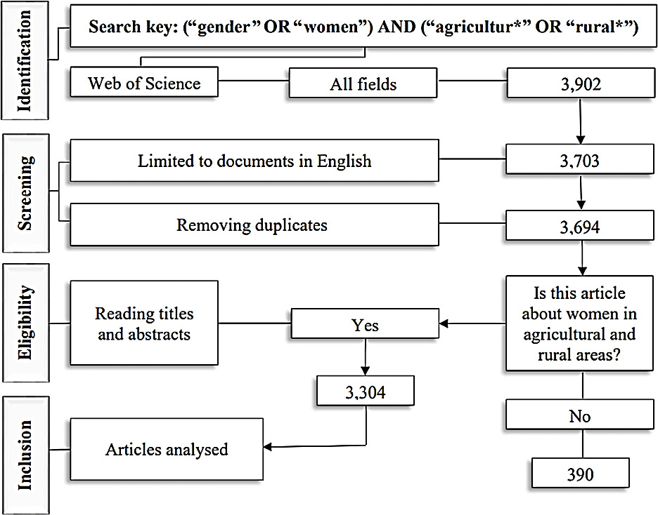 This study systematically reviewed the global academic literature on the roles and challenges faced by women in agriculture. The earliest identified research dates back to 1991, so the analysis covers the period from 1991 to 2024. Data for this study was sourced from the Web of Science database. The search criteria included articles with the keywords (“gender” OR “women”) AND (“agricultur*” OR ”rural*”). The asterisk (*) serves as a truncation symbol, capturing all variations of words beginning with “agriculture*” (e.g. “agriculture”, “agricultural research”) and “rural” (e.g. “rural areas”). A comprehensive search conducted on 2 September 2024 identified 3,902 relevant documents on the research topic worldwide, following the Preferred Reporting Items for Systematic Reviews and Meta-Analyses (PRISMA) approach illustrated in Figure 1.