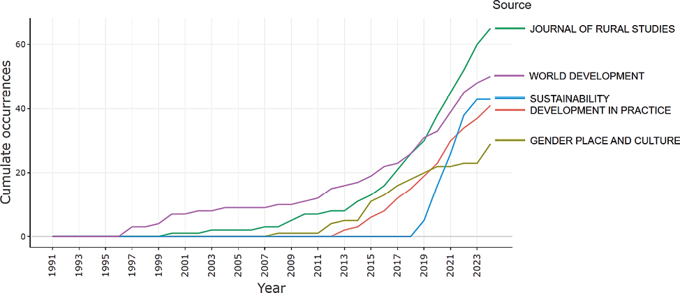 The annual growth of publications can vary across different sources. Analysing the cumulative growth of documents in the top 5 related sources in the dataset, as displayed in Figure 3, shows the greatest number of publications in the Journal of Rural Studies (60 papers), World Development (48 papers), and Sustainability (38 papers). Notably, since 2019, the Journal of Rural Studies has been the leading publication in this research area, followed closely by World Development. All other sources have published 29 or fewer articles throughout the entire study period.