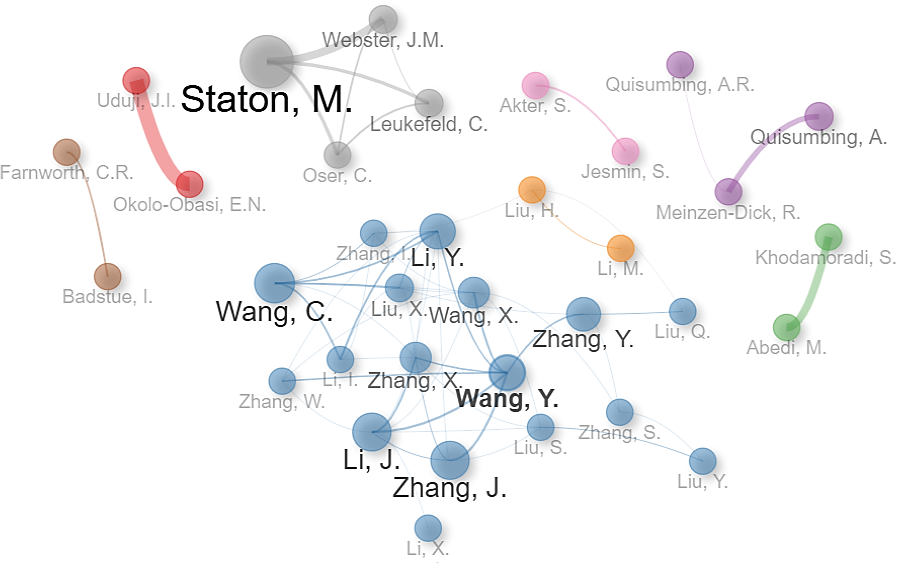 Throughout the analysed period, most authors have originated from the United States, underscoring its leading role in research output. Meanwhile, both India and China have increasingly focused on gender equality and women’s empowerment in agriculture. In China, the 2003 Rural Land Contracting Law (RLCL) was introduced to safeguard rural land rights and to ensure equitable distribution for women. Other programmes aimed at supporting women’s income security and resilience have also been implemented, attracting scholarly interest in their impact on women’s roles in agriculture (Gong et al., 2022; Shi et al., 2024). Similarly, India has launched several initiatives to enhance women’s participation in agriculture, including the Mahila Kisan Sashaktikaran Pariyojana (Women Farmer Empowerment Program), a centrally funded scheme to strengthen women’s roles in agricultural activities. Other programmes further promote women’s representation and engagement in farming (Barooah et al., 2023).