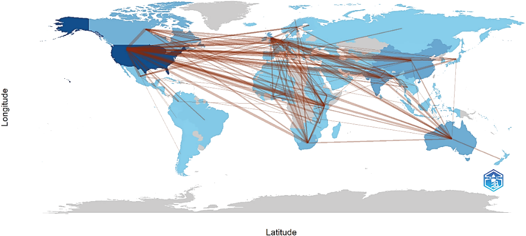 From the standpoint of collaboration between countries shown in Figure 5, the most extensive collaboration is between the United States and China, with 52 published documents. Additionally, the United States collaborates significantly with India (41 papers), the United Kingdom (40 papers), Kenya (31 papers), and Canada (27 papers). Other collaborations have resulted in 20 or fewer papers. Collaborations usually involve a country with a robust research base on one side and a country addressing the examined problem on the other.
