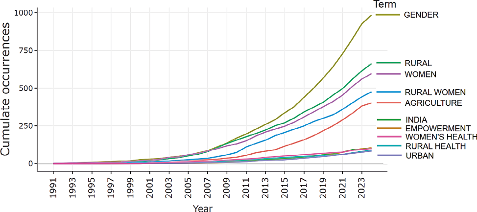 As shown in Figure 6, among the top 25 most frequently used keywords, those with the highest occurrences include “gender” (985 occurrences), “rural” (662 occurrences), “women” (597 occurrences), “rural women” (476 occurrences), “agriculture” (402 occurrences), “India” (104 occurrences), and “empowerment” (101 occurrences). Other keywords have 99 or fewer occurrences. Additionally, the frequency of the top 10 authors’ keywords has not significantly changed over the analysed period.