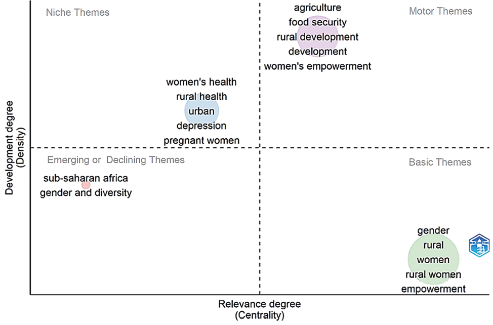 The lower right quadrant highlights key yet emerging themes, such as the empowerment of rural women within the agricultural sector. The large node size reflects significant academic interest and a growing body of research in this area. Although these themes are gaining prominence they remain underdeveloped, underscoring the need for further research and integration with established fields to unlock their full potential. Empowering rural women enhances their social and economic roles, contributing to societal development. Research indicates that empowering women improves decision-making power, increases household income, and strengthens community resilience (Doss, 2006; Akter and Chindarkar, 2020), highlighting the importance of further analysis.