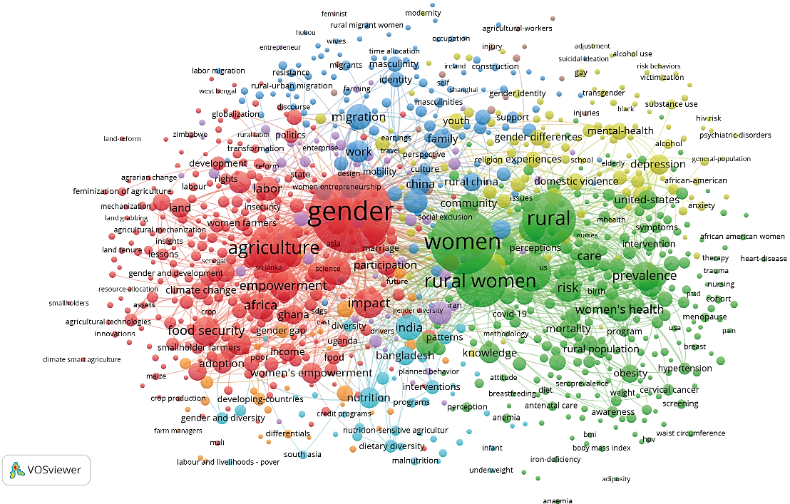 The largest red cluster, consisting of 296 items, prominently features the terms “gender” (907 links, link strength 8,279) and “agriculture” (633 links, link strength 3,325), underscoring the importance of gender-related issues in agriculture. Additionally, terms such as “food security”, “empowerment”, and “poverty” frequently co-occur within the same cluster, highlighting their interconnectedness.