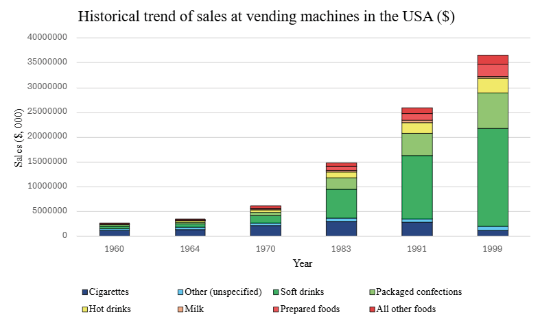 Even with these new trends of consumers increasingly choosing processed and fast foods – favoured by an increasingly industrialised food sector, changes in family dynamics and intense marketing campaigns by food companies (Levenstein, 2003a; Recordati, 2015) – the vending sector never managed to completely convince consumers to rely on vending machines when purchasing foods more complex than simple snacks (Segrave, 2002). In fact, excluding cigarettes, which accounted for just over 40% of sales, approximately $1.6 billion of sales in 1964 was attributed to foods intended for immediate consumption, especially coffee, soft drinks and packaged confections (37.68% of the total). Conversely, more complex foods traditionally consumed as part of a complete meal either at home or in other private locations, such as milk, ice cream and prepared and hot canned foods, constituted a niche market whose sales amounted to approximately $290,000 (8.29% of the total; Table 2; Figure 1). This trend remained virtually unchanged in the subsequent decades, with soft drinks dominating the market (53.98% of sales in 1999; Table 2; Figure 1). In other words, the dream of automatic stores and restaurants never quite materialised, largely because vending machines could not replicate the human shopping experience (Segrave, 2002). Moreover, the industry did not expand into new markets, but rather further penetrated existing ones, particularly factories, public places, universities and offices (Table 1).