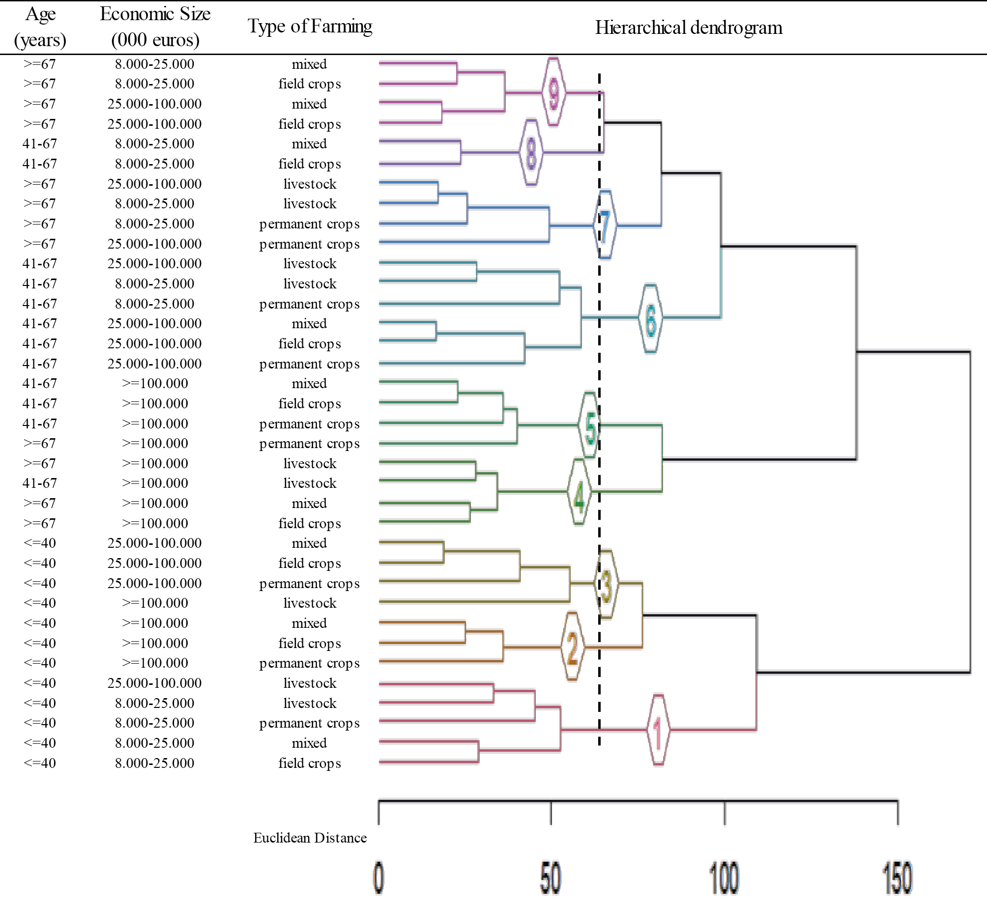 | Type of farming | - Field crops (1-2) - Permanent crops (3) - Livestock (4-5)- Mixed (6-9) |