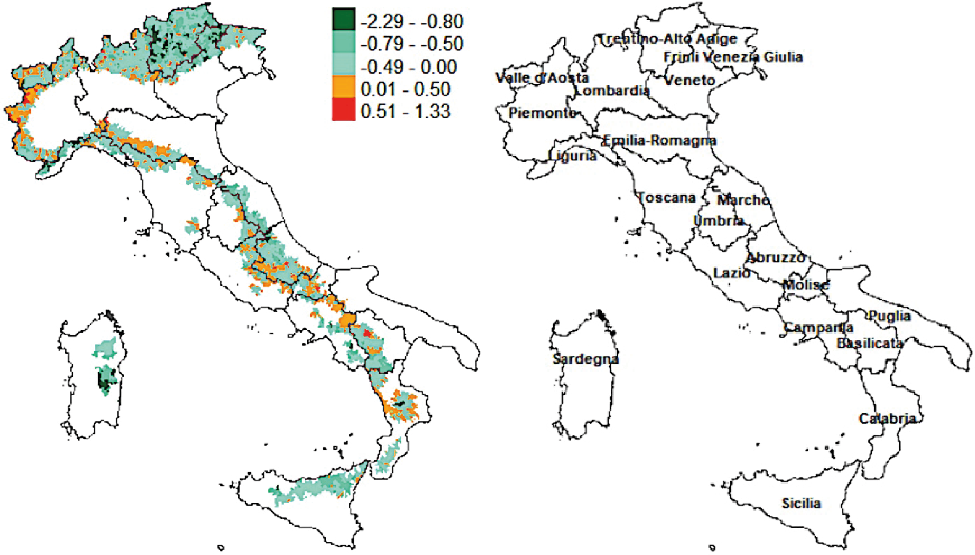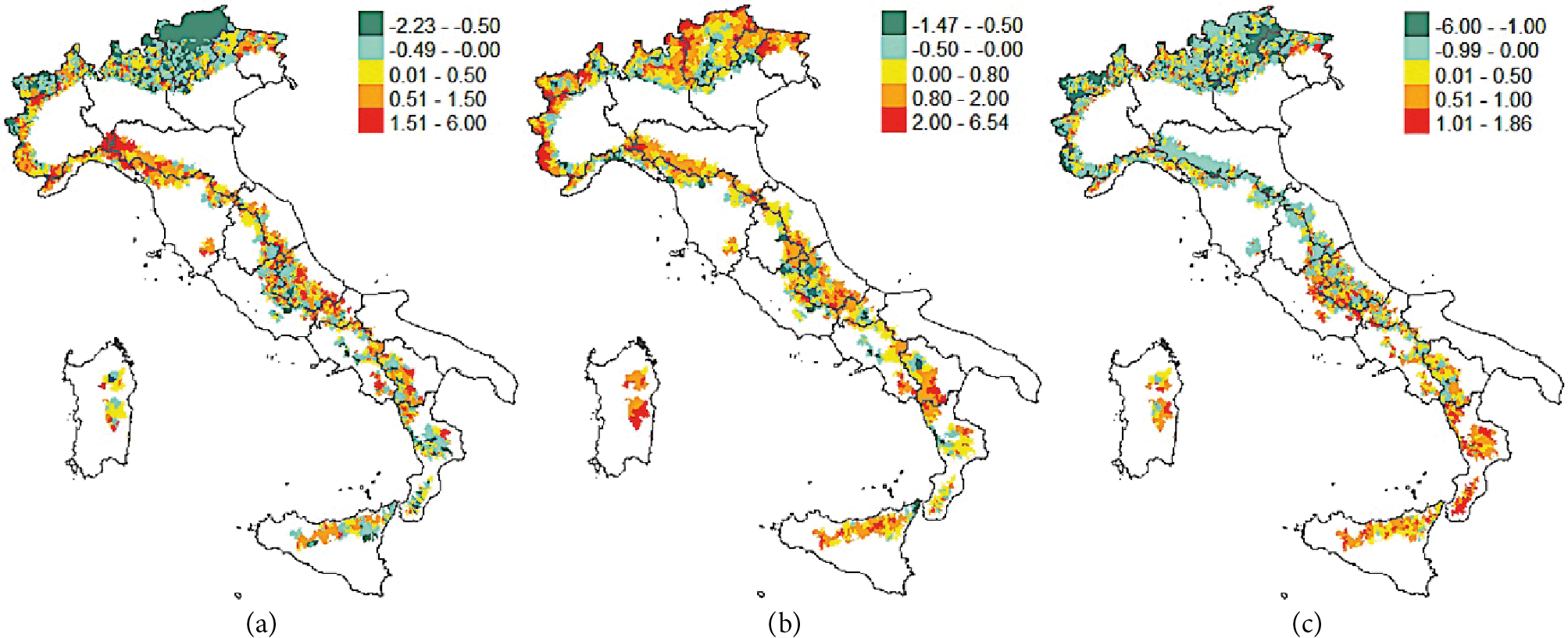 Italian mountain areas have multiple vulnerabilities. The impact of earthquakes is often devastating, and the fragile socio-economic structure of these places emerges as a critical factor in earthquakes, particularly in the Apennine areas (Pagliacci et al., 2021). Landslides have a significant impact in terms of loss of life and natural resources (Trigila, Iadanza, 2018), which can be exacerbated by the impact of climate change in inner areas, both in terms of frequency (Gariano et al., 2018) and intensity (Esposito et al., 2023). These events are also linked to the abandonment of agriculture, which has accelerated in mountain areas (Dax et al., 2021), leading to changes in land use and forest cover (Rumpf et al., 2022). These changes have been confirmed by future change models (Gobiet, Kotlarski, 2020).