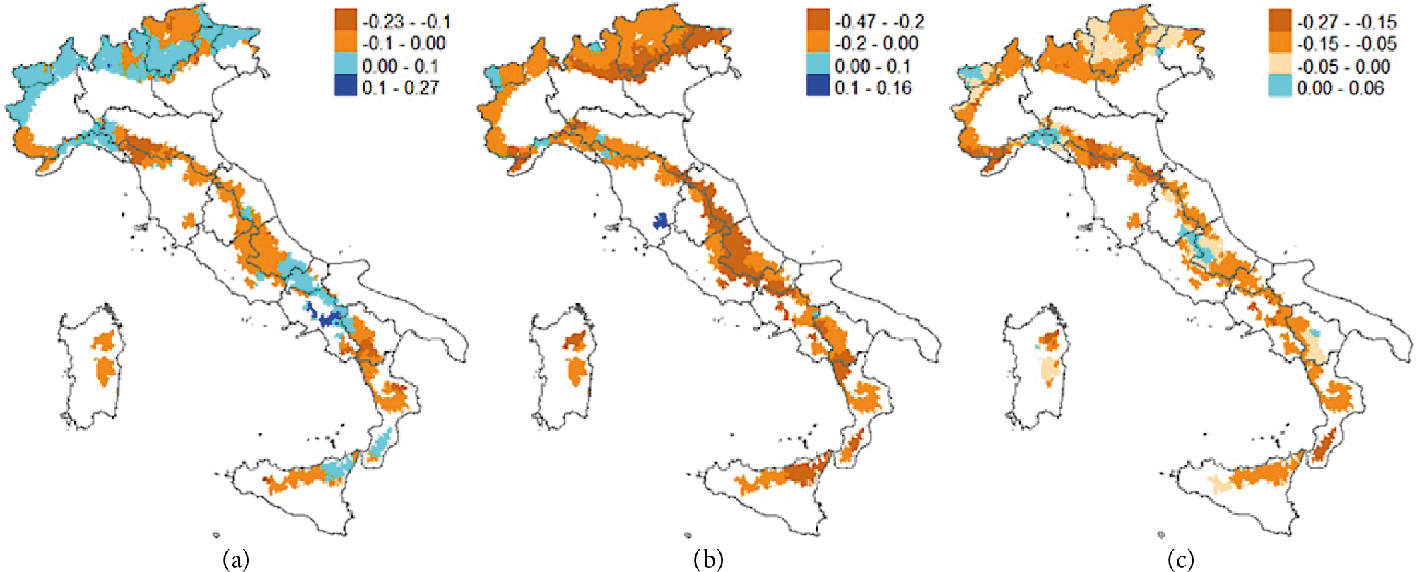 Figure 2 displays the spatial distribution of the three aforementioned indexes in mountain areas. At a local scale, DWI and EWI exhibit a clear increasing gradient moving from northern to southern Italy (with a few exceptions for DWI in the most southern part of the country). There is much more widespread heterogeneity for SDI, which does not display any particular clusters but does show the presence of a majority of municipalities where essential services are absent.