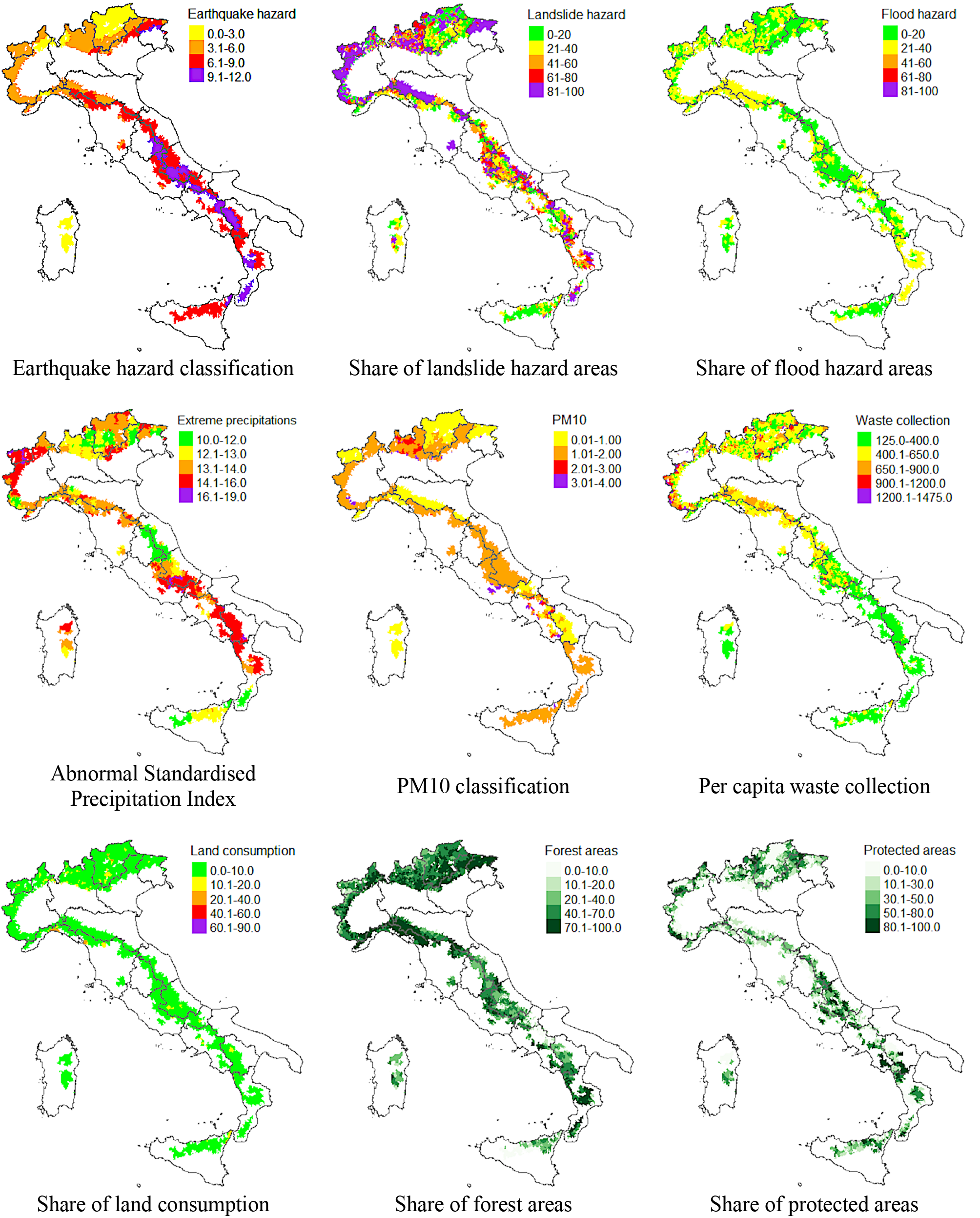 The first phase involved nine variables related to the environmental domain (Table 1). We maintained the original value (level of risk) of the indicators earthquake hazard (EH) and particulate matter pollution (PM10) and considered them quantitative variables. We derived landslide hazard (LH), flood hazard (FH), land consumption (LC), protected areas (PA), and forest areas (FA) by dividing the original values by the corresponding municipal areas. Waste collection (WA) is the annual waste per inhabitant (in kilograms). Finally, we calculated monthly average precipitation (A_SPI; the Abnormal Standardised Precipitation Index) as follows. The standardised precipitation index (SPI) was determined as SPI-12 (12 months of accumulation) (Bordi et al., 2007) over a 30-year period and after the time series (one for each municipality). Then, we calculated the fraction of times for which |SPI| > 1.5: , giving the same consideration to drier and wetter periods when defining its contribution to vulnerability.