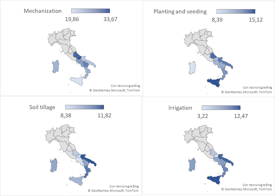 Mechanisation is the production process with the highest level of innovative investments, both nationally (28%) and by region (29% for northern, 31% for central, and 24% for southern). However, in the Southern Italy, this percentage is slightly lower, while innovation in planting and seeding (12%), soil tillage (10%), and irrigation (9%) is relatively more significant. The analysis of investment choices among southern regions shows a heterogenous situation (Figure 3).