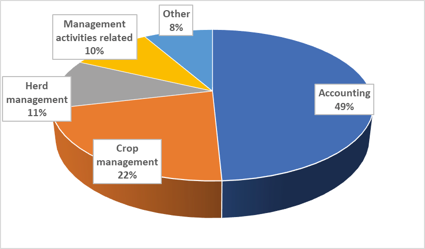 Finally, the digitisation of Italian farms has outperformed other innovative processes, as 16% of farms have adopted it. There is great variation between the regions, especially northern (33.1%) and southern (7.7%) Italy. Traditional applications, such as accounting, are still widely used in production processes, both in the field and in the stable (Figure 4).